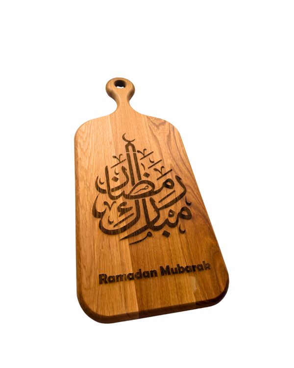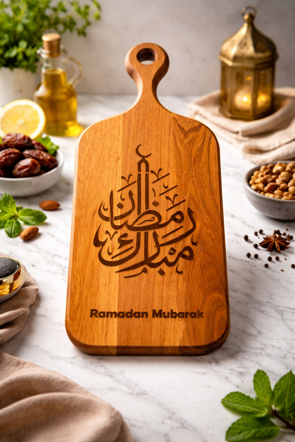 Dieses große Schneidebrett aus hochwertigem Holz wird mit der arabischen Schrift „Ramadan Mubarak“ liebevoll graviert und ist ein ganz besonderes Stück für die gesegnete Zeit des Ramadans.